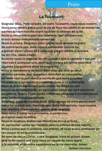 Seigneur Dieu, Père céleste, en cette Toussaint, nous nous rassemblons pour rendre grâce pour la vie de tous tes saints et de toutes tes saintes