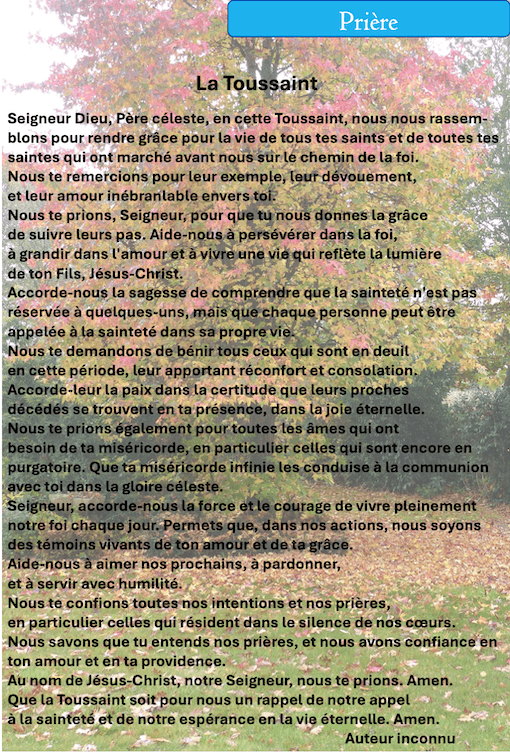 Seigneur Dieu, Père céleste, en cette Toussaint, nous nous rassemblons pour rendre grâce pour la vie de tous tes saints et de toutes tes saintes qui ont marché avant nous sur le chemin de la foi. Nous te remercions pour leur exemple, leur dévouement, et leur amour inébranlable envers toi. Nous te prions, Seigneur, pour […]