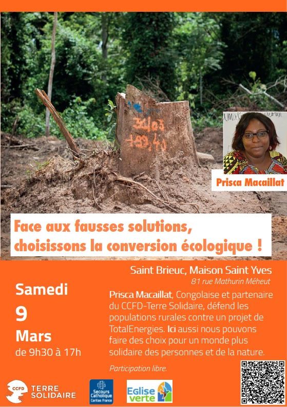 A noter que Prisca Macaillat donne une conférence le lundi 11 mars à 16h30 et à 20h30 à l’abbaye de Saint-Jacut-de-la Mer sur le thème : « La compensation carbone au prix des droits humains ? ». La transition écologique doit-elle se faire au prix des droits humains ? Prisca Macaillat responsable des projets à la Commission Diocésaine Justice et Paix de Pointe Noire (Congo) présentera son combat contre le projet BaCaSi de TotalEnergies qui, pour compenser ses émissions de CO² accapare les terres des populations locales. En savoir plus : ccfd-terresolidaire.org/la-compensation-carbone-au-prix-des-droits-humains