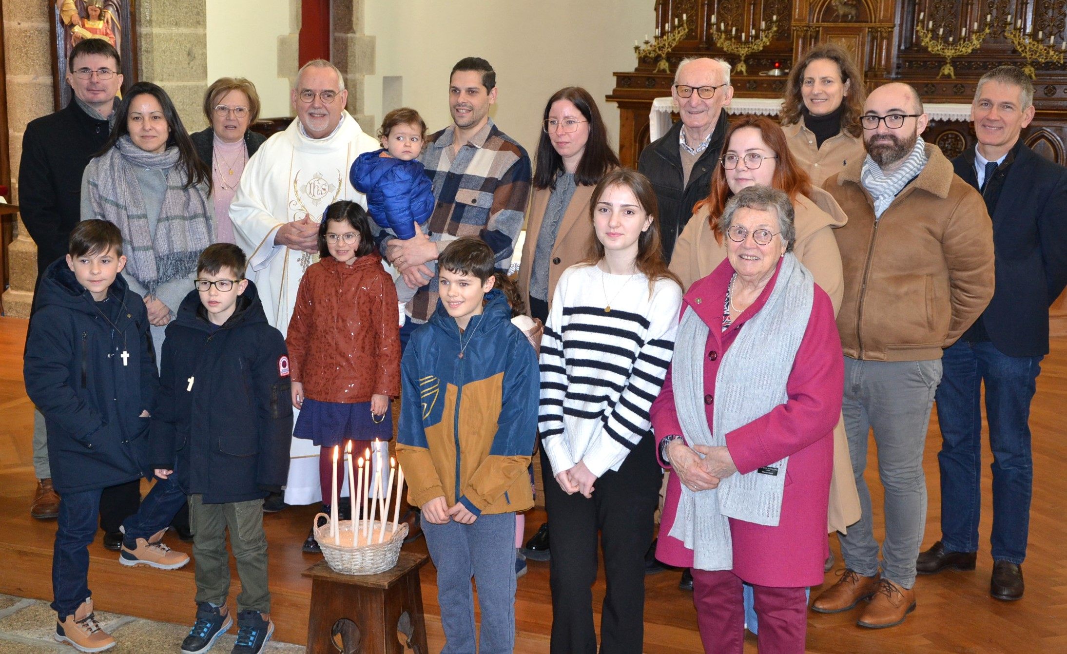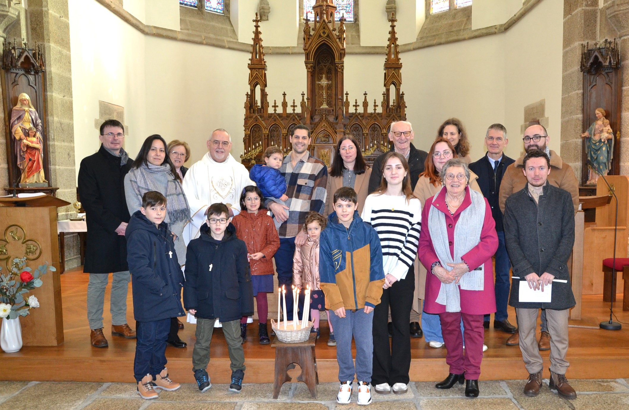 Le Père Guy Marzin entouré des cinq catéchumènes et de leur famille ainsi que des familles accompagnatrices