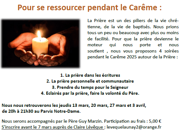 La Prière est un des piliers de la vie chrétienne, de la vie de baptisés. Nous prions tous un peu ou beaucoup avec plus ou moins de facilité. Pour que la prière devienne le moteur qui nous porte et nous soutient, nous vous proposons 4 soirées autour de la Prière ,pendant le Carême 2025 :