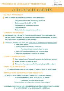 Cette année, concours de crèches : il a lieu du 1er au 18 décembre Vous trouverez le règlement dans le bulletin paroissial et ci-dessous :