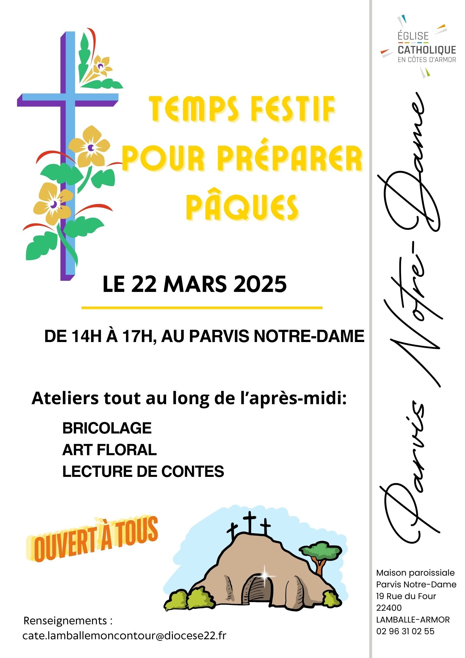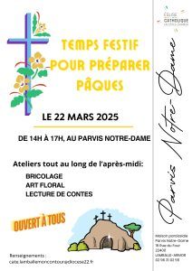 Le samedi 22 mars, de 14 h à 17 h, les équipes de la catéchèse et d’animation du Parvis Notre-Dame vous invitent à un après-midi dont le thème sera : « Se préparer à Pâques ».