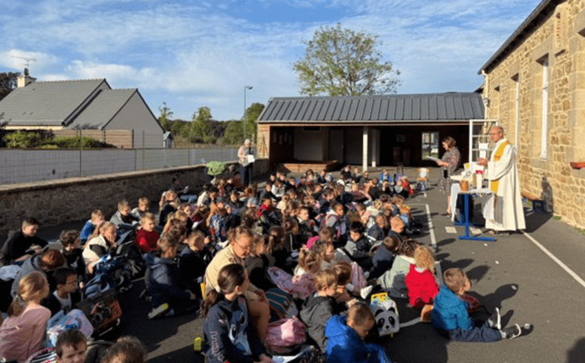 Célébration de la bénédiction des cartables à l’école Saint Yves de Bréhand, par le Père Laurent Le Meilleur, le 19 septembre 2025.