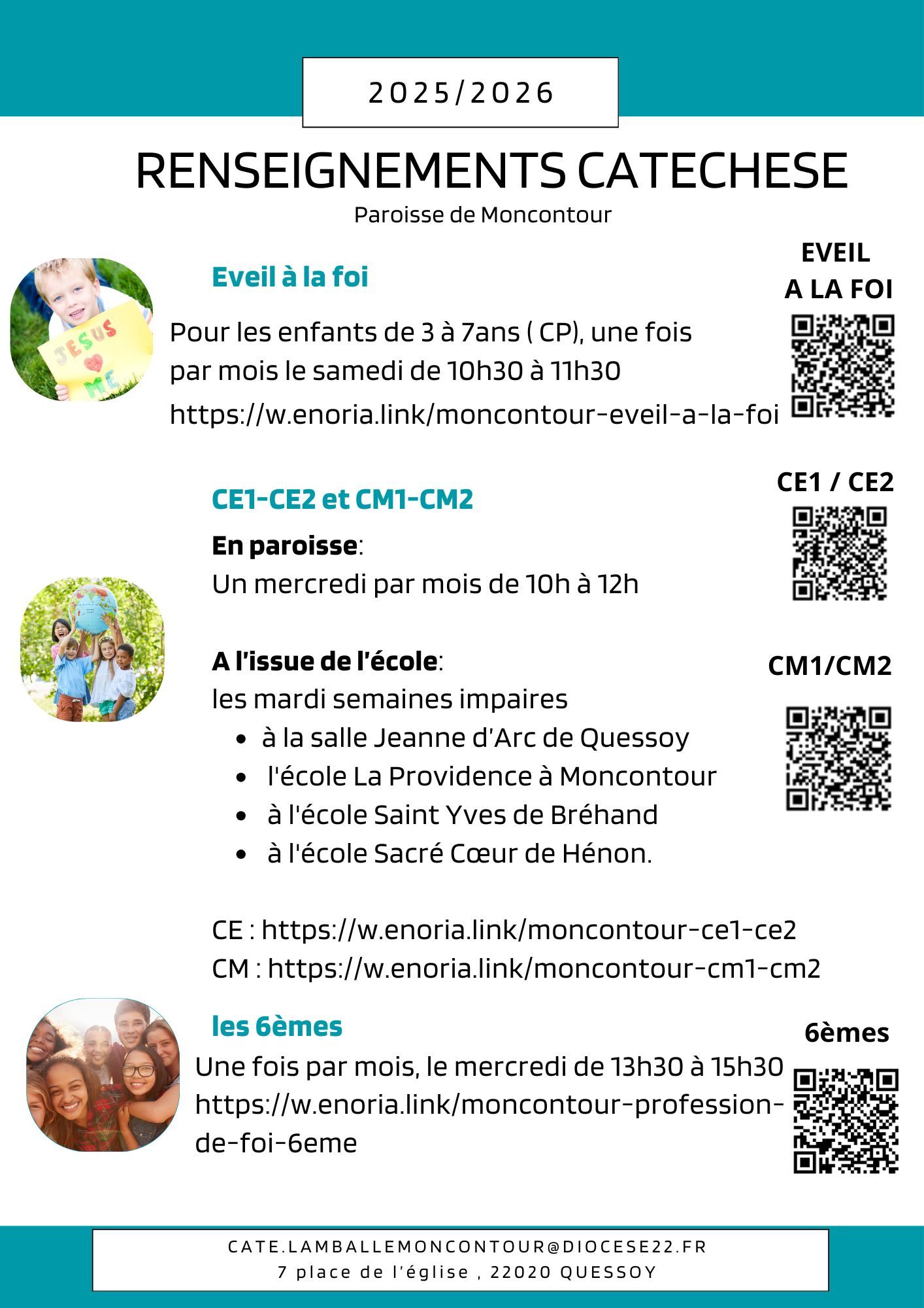 - Rencontres de catéchèse après la classe (du CE1 au CM2) : mardi 13 et 27 janvier, de 16 h 40 à 17 h 45, à Hénon, Quessoy, Moncontour et Bréhand