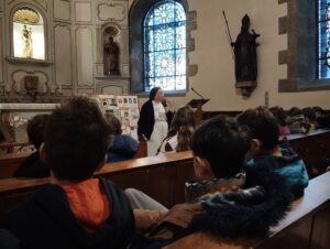 Après avoir vécu la messe à la chapelle Saint Thomas, Sœur Marie-Odile et Sœur Noélie ont accueilli les enfants et partagé l’histoire d’Ange Le Proust et de leur communauté. En début d’après-midi, Maryvonne Cantin et Bernadette Coupé ont témoigné auprès des enfants en partageant leur mission pour Présence fraternelle au foyer logement du Gouessant. Leur témoignage a captivé l’attention des enfants : un simple bonjour est témoignage de notre foi en Jésus Christ.