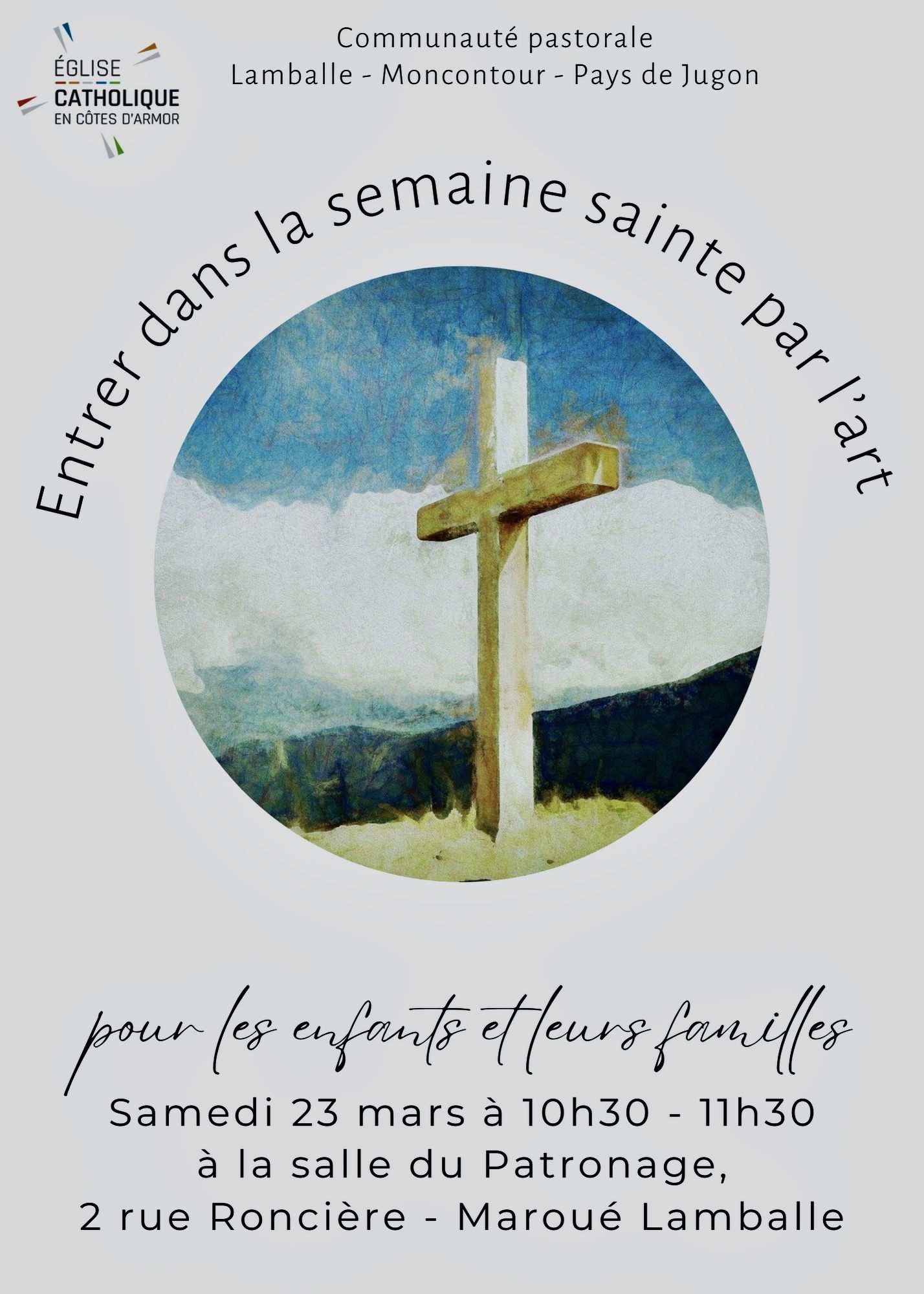 Claire Le Tillois-Yu-Yueng propose aux enfants et à leur famille un temps de méditation à partir d’œuvres d’art autour de la Semaine Sainte, samedi 23 mars de 10h30 à 11h30, à la salle du patronage à Maroué. Venez nombreux !